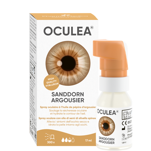Le OCULEA® ARGOUSIER spray oculaire, ni conservateur, soulage les symptômes de sécheresse oculaire et hydrate la peau autour des yeux. Les principes actifs de cette microémulsion sont l’huile d’argousier et l’acide hyaluronique. Peut être utilisé en cas de sensibilité oculaire, de port de lentilles de contact et après le maquillage.