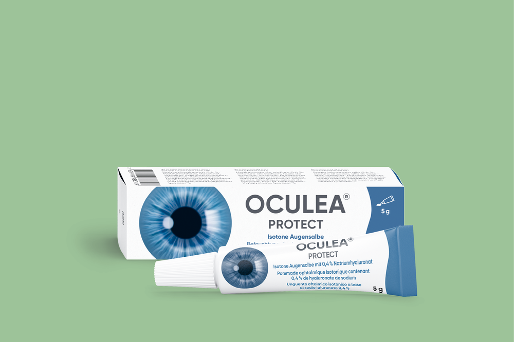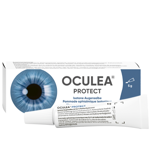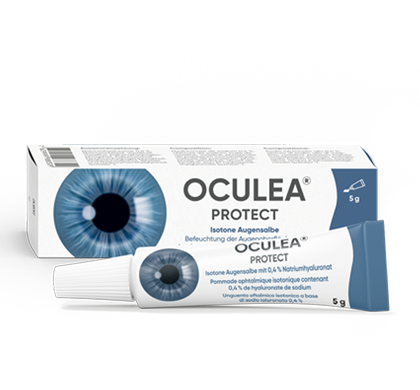 Die Rezeptur der OCULEA® PROTECT Augensalbe begünstigt den Verbleib an der Augenoberfläche. Die Hyaluronsäure bildet eine Schutzschicht auf der Hornhautoberfläche, die das Auge befeuchtet und schützt.