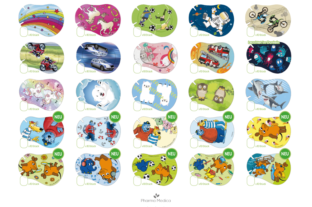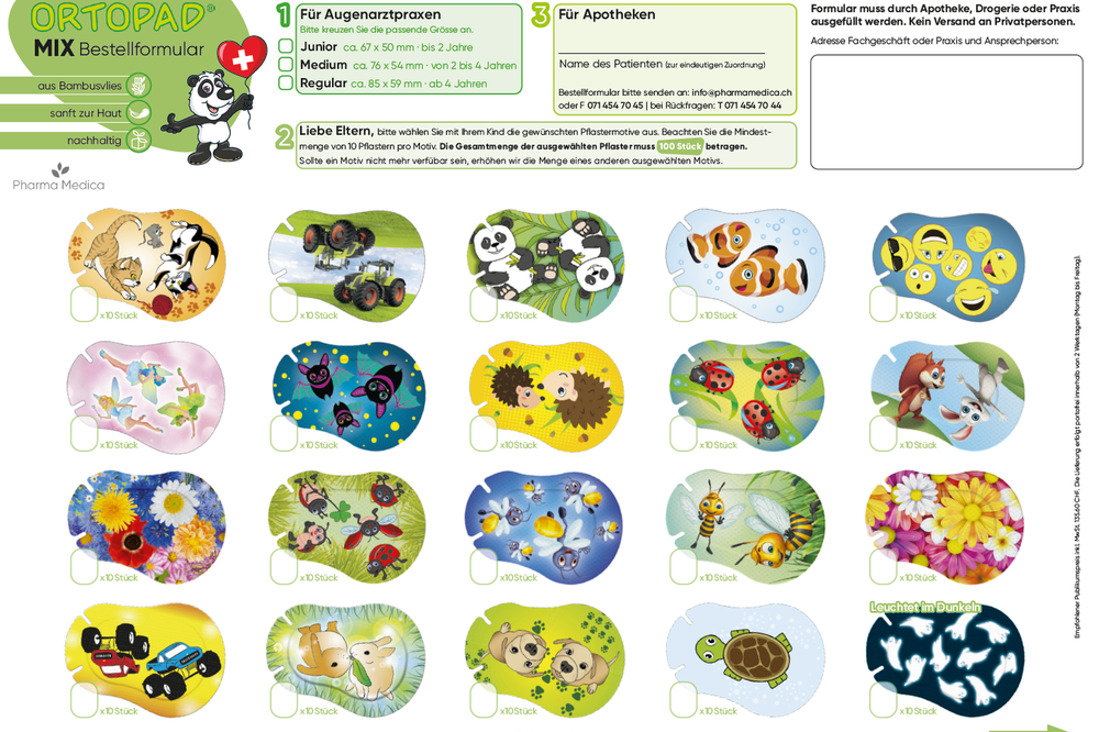 Unsere Augenokklusionspflaster zum individuellen Mischen aus über 40 Motiven mit und ohne Leuchteffekt. Jede Packung ORTOPAD® Mix enthält 100 Augenpflaster und kann aus bis zu 10 unterschiedlichen Motiven Ihrer Wahl zusammengestellt werden (mindestens 10 Pflaster pro Motiv).