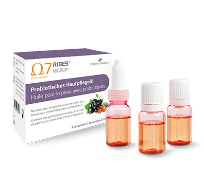 Ω7 Ribes Nigrum® Probiotisches Hautpflegeöl mit lebenden Milchsäurebakterien und Öl aus Schwarzen Johannisbeeren und Sanddornbeeren.